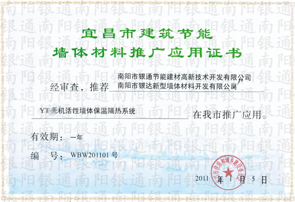 宜昌市建筑節(jié)能墻體材料推廣應(yīng)用證書 經(jīng)審查,推薦南陽市銀通節(jié)能建材高新技術(shù)開發(fā)有限公司,南陽市銀達(dá)新型墻體材料開發(fā)有限公司,YT無機(jī)活性墻體保溫隔熱系統(tǒng)在我市的推廣應(yīng)用。 有效期:一年 編號(hào):WBW201101號(hào) 2011年1月5日