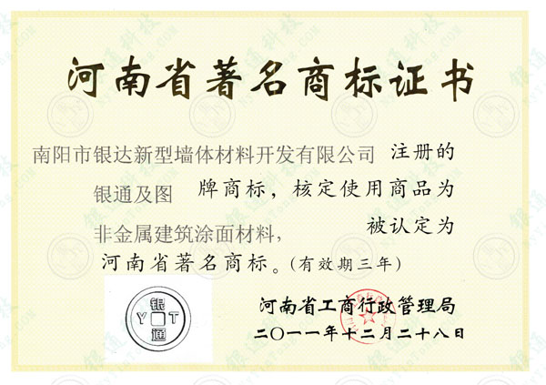 注: 此證書有效期三年,目前已失效,本介紹頁僅為方便用戶了解企業(yè)歷史資質,望悉知 河南省著名商標證書 南陽市銀達新型墻體材料開發(fā)有限公司 注冊的銀通及圖(銀通·YT)牌商標,核定使用商品為非金屬建筑涂面材料,被認定為河南省著名商標。(有效期三年) 河南省工商行政管理局 二〇一一年十二月二十八日