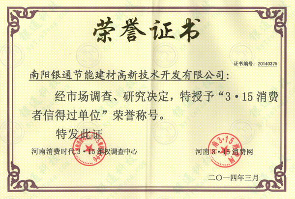 經(jīng)市場調(diào)查、研究決定,特授予“3·15消費者信得過單位”榮譽稱號。