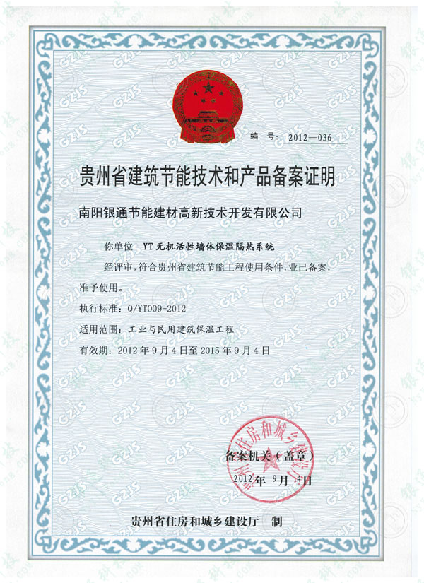貴州省建筑節(jié)能技術(shù)和產(chǎn)品備案證書(shū) 編號(hào):2012—036 南陽(yáng)銀通節(jié)能建材高新技術(shù)開(kāi)發(fā)有限公司 你單位YT無(wú)機(jī)活性墻體保溫隔熱系統(tǒng) 經(jīng)評(píng)審,符合貴州省建筑節(jié)能工程使用條件,業(yè)已備案,準(zhǔn)予使用。 執(zhí)行標(biāo)準(zhǔn):Q/YT009-2012 適用范圍:工業(yè)與民用建筑保溫工程 有效期:2012年9月4日至2015年9月4日 備案機(jī)關(guān)(蓋章):貴州省住房和城鄉(xiāng)建設(shè)廳 2012年9月4日 貴州省住房和城鄉(xiāng)建設(shè)廳 制