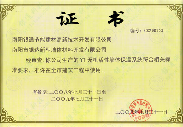 河北滄州市建筑節(jié)能墻體材料產(chǎn)品登記證 編號 CRZ08153 南陽銀通節(jié)能建材高新技術(shù)開發(fā)有限公司 南陽市銀達(dá)新型墻體材料開發(fā)有限公司 經(jīng)審查你公司生產(chǎn)的YT無機(jī)活性墻體保溫系統(tǒng)負(fù)荷相關(guān)標(biāo)準(zhǔn)要求 準(zhǔn)許在全市建筑工程中使用 有效期2008年7月31日至2009年7月31日 滄州市建筑節(jié)能墻體材料產(chǎn)品使用登記專用章
