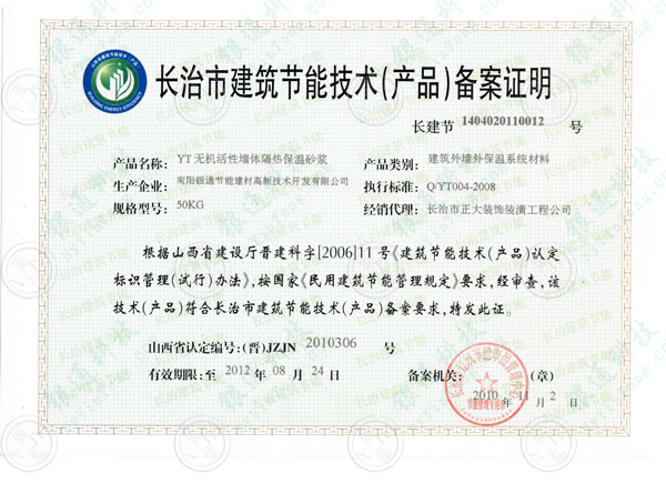 山西長治市建筑節(jié)能技術(shù)產(chǎn)品備案證明 長建節(jié) 1404020110012號 產(chǎn)品名稱yt無機活性墻體隔熱保溫砂漿 產(chǎn)品類型 建筑外墻外保溫系統(tǒng)材料 生產(chǎn)企業(yè) 南陽銀通節(jié)能建材高薪技術(shù)開發(fā)有限公司 執(zhí)行標準 Q/YT2004-2008規(guī)格型號 50KG 根據(jù)山西省建設(shè)廳晉建科字【2006】11號建筑節(jié)能技術(shù)產(chǎn)品認定標識管理試行方法,按國家民用建筑節(jié)能管理規(guī)定要求,經(jīng)審查 該技術(shù)產(chǎn)品符合長治市建筑節(jié)能技術(shù)產(chǎn)品備案要求 特發(fā)此證 山西省認定編號 晉JZJN2010306號 有效期限至2012年08月24日 備案機關(guān) 長治市建筑節(jié)能產(chǎn)品管理中心
