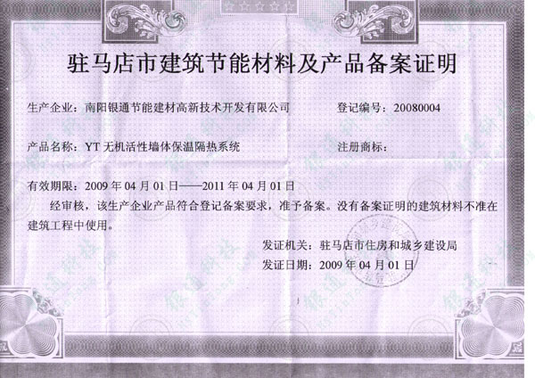 河南省駐馬店市建筑節(jié)能材料及產(chǎn)品備案證書 企業(yè)名稱 南陽市銀達新型墻體材料開發(fā)有限公司南陽銀通節(jié)能建材高新技術(shù)開發(fā)有限公司 單位地址 南陽市機場南路312國道西側(cè) 產(chǎn)品名稱YT無機活性墻體保溫隔熱系統(tǒng) 系統(tǒng)類別無機活性墻體保溫隔熱系統(tǒng) 證書編號20080004 有效期限至2011年4月1日 注冊商標銀通 銀達 經(jīng)審核,該生產(chǎn)企業(yè)產(chǎn)品符合登記備案要求 準予備案沒有備案證明的建筑材料不準在建筑工程中使用 發(fā)證機關駐馬店市住房和城鄉(xiāng)建設廳 發(fā)證日期2009年4月1日