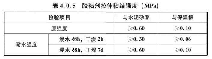 4.0.5 膠粘劑拉伸粘結(jié)強(qiáng)度應(yīng)符合表4.0.5的規(guī)定。膠粘劑與保溫板的粘結(jié)在原強(qiáng)度、浸水48h且干燥7d后的耐水強(qiáng)度條件下發(fā)生破壞時(shí),破壞部位應(yīng)位于保溫板內(nèi)。