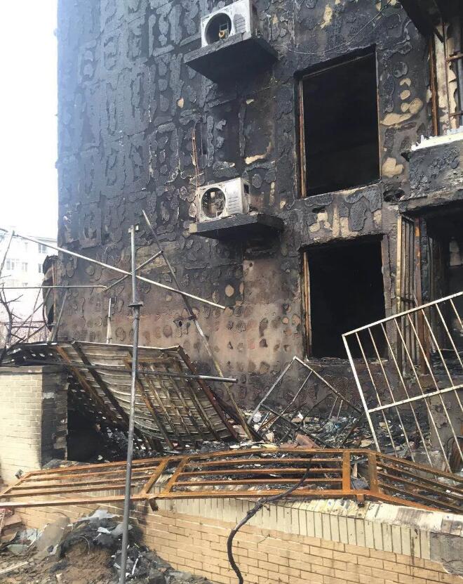 2月24日中午12點(diǎn)20分左右,北京市朝陽區(qū)安貞西里二區(qū)20號(hào)樓樓下西南角的一棚子起火。從圖片來看,這部分過火之處的外墻涂料和保溫系統(tǒng)的防護(hù)面層已經(jīng)脫落,露出暗桔黃色的保溫材料,這種保溫材料在過火以后基本上碳化而沒有燃燒,但一樓的大部分板材在高溫、碳化、變形后脫落了。