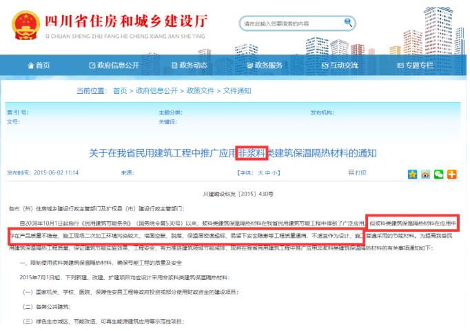 四川省住建廳在2020年6月發(fā)布的關(guān)于發(fā)布建筑保溫材料推廣、限制和禁止產(chǎn)品目錄的公告中限制使用類產(chǎn)品中明確限制范圍:不得用于國家機關(guān)、學(xué)校、醫(yī)院、保障性安居工程等政府投資或部分使用財政資金的建設(shè)項目;各類公共建筑;綠色生態(tài)城區(qū)、節(jié)能改造、可再生能源建筑應(yīng)用等示范性項目;建筑地上總層數(shù)超過6層(含6層)的建設(shè)項目;以上項目中不得用于外墻、屋面、樓地面作為主要保溫隔熱材料使用。
