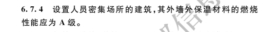 6.7.4 設(shè)置人員密集場(chǎng)所的建筑,其外墻外保溫材料的燃燒性能應(yīng)為A級(jí)。