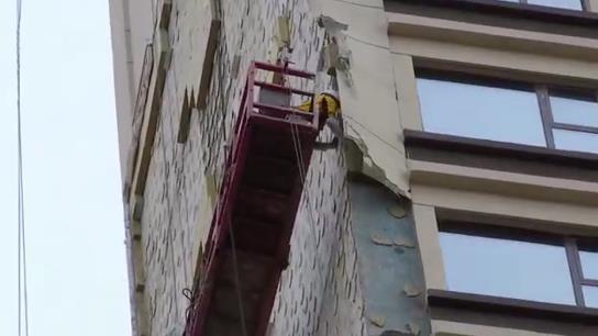 記者看到,現(xiàn)場已經有工人開始對外墻保溫層進行了維修。 高達30多層樓的外墻, 從14層到23層, 大約有27米。27米 的保溫層外立面大面積脫落,已經露出了混凝土,那這保溫層好好的 怎么 就掉了呢?