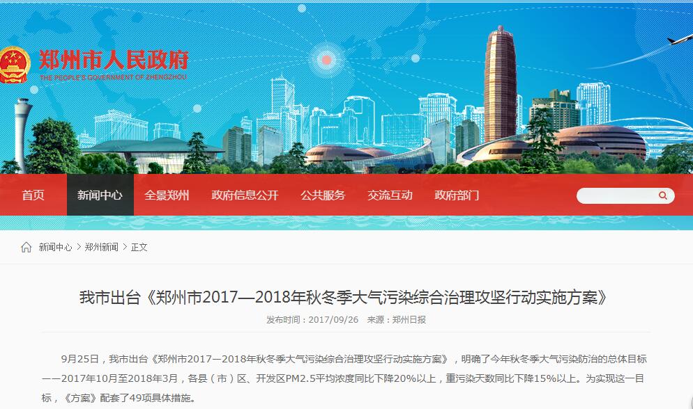 為了配合環(huán)境保護部、國家發(fā)展和改革委員會、工業(yè)和信息化部、公安部、財政部、住房城鄉(xiāng)建設部、交通運輸部、工商總局、質(zhì)檢總局、國家能源局十部委聯(lián)合北京市、 天津市、河北省、山西省、山東省、河南省共同發(fā)布《京津冀及周邊地區(qū)2017-2018年秋冬季大氣污染綜合治理攻堅行動方案》,9月25日,鄭州市出臺《鄭州市2017—2018年秋冬季大氣污染綜合治理攻堅行動實施方案》,明確了2017年秋冬季大氣污染防治的總體目標——2017年10月至2018年3月,各縣(市)區(qū)、開發(fā)區(qū)PM2.5平均濃度同比下降20%以上,重污染天數(shù)同比下降15%以上。為實現(xiàn)這一目標,《方案》配套了49項具體措施,其中,涉及建材行業(yè)的有:
