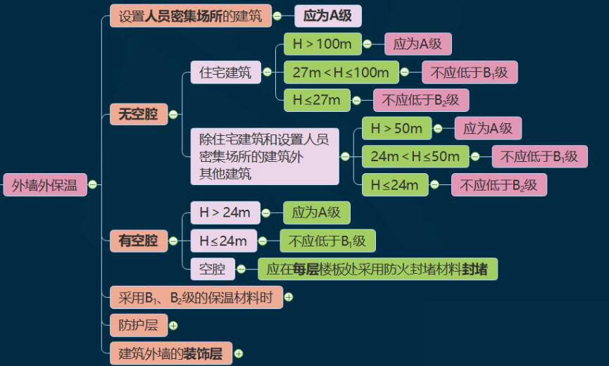 現(xiàn)在建筑外墻外保溫應用較多,形式也更多樣,分為無空腔和有空腔。除了人密必須A級之外,其他建筑首先要看是有空腔,還是無空腔再來確定保溫材料的最低耐火等級。有空腔因為容易在空腔部位產(chǎn)生煙筒效應更加危險,要求比無空腔也更加嚴格。