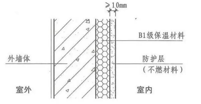 建筑內(nèi)保溫人密(人多,發(fā)生火災不利于疏散),用火油氣(火災危險性大的場所),疏散通道(著火了要從這些地方跑或避難)采用A級;其他B1級并且因為是室內(nèi)如果產(chǎn)生有毒煙氣會造成人員傷亡要求低煙低毒。下圖為內(nèi)保溫采用B1級材料時,防護層設置示意圖。