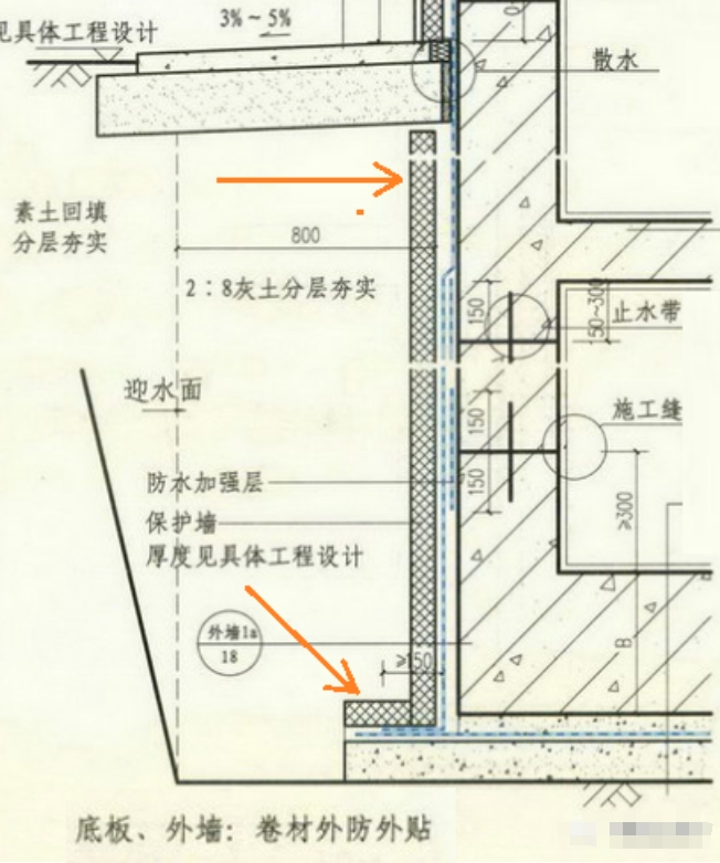 ↘↘如下圖所示外防外貼法:地下室外墻基層處理后進(jìn)行卷材防水施工