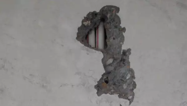 分析:墻面空洞很明顯是由于建造時在刷墻階段混入了垃圾造成的,可以看見里面有廢棄的鐵絲。
