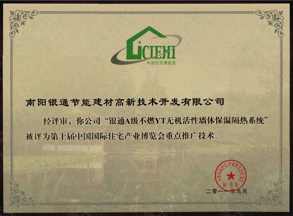 南陽(yáng)銀通節(jié)能建材高新技術(shù)開(kāi)發(fā)有限公司 經(jīng)評(píng)審,你公司“銀通A級(jí)不燃YT無(wú)機(jī)活性墻體保溫隔熱系統(tǒng)”被評(píng)為第十屆中國(guó)國(guó)際住宅產(chǎn)業(yè)博覽會(huì)重點(diǎn)推廣技術(shù)。 中國(guó)國(guó)際住宅產(chǎn)業(yè)博覽會(huì)組委會(huì) 秘書(shū)處 二零一一年九月 第十屆中國(guó)國(guó)際住宅產(chǎn)業(yè)博覽會(huì)重點(diǎn)推廣技術(shù)