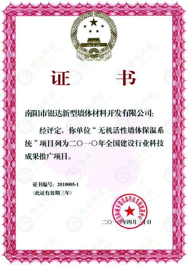 2010全國(guó)建設(shè)行業(yè)科技成果推廣項(xiàng)目證書 有效期:三年 。 頒發(fā)時(shí)間 2010年4月30日