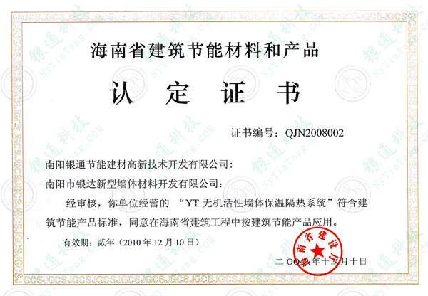此證書(shū)為歷年曾獲證書(shū),本介紹頁(yè)僅為方便用戶(hù)了解查詢(xún)企業(yè)歷史資質(zhì),望悉知 海南省建筑節(jié)能產(chǎn)品核準(zhǔn)證書(shū) 有效期兩年,截至日期 2010年12月10日