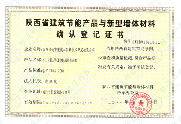 陜西省建筑節(jié)能產(chǎn)品與新型墻體材料確認(rèn)登記證書(shū) 有效期限 :2011年5月16日至2013年5月16日