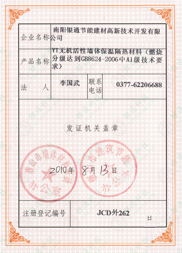 河北省唐山市建筑工程材料進市登記證書 唐山市墻體材料革新辦公室 唐山市建筑節(jié)能辦公室 企業(yè)名稱南陽銀通節(jié)能建材高薪技術開發(fā)有限公司 產(chǎn)品名稱YT無機活性墻體保溫隔熱材料 燃燒分級達到GB8624-2006中A1級技術要求 發(fā)證機關 唐山市墻體材料革新辦公室 唐山市建筑節(jié)能辦公室 注冊登記編號 JCD外262