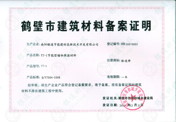 河南省鶴壁市建筑材料備案證明 備案編號(hào)HB20070002 企業(yè)名稱南陽(yáng)銀通節(jié)能建材高新技術(shù)開發(fā)有限公司 產(chǎn)品名稱YT-1節(jié)能型墻體保溫材料 規(guī)格型號(hào)YT-A 注冊(cè)商標(biāo)銀通牌 產(chǎn)品標(biāo)準(zhǔn)Q/YT004-2008 有效期限一年 經(jīng)審核,該生產(chǎn)企業(yè)產(chǎn)品符合登記備案要求 準(zhǔn)予備案沒(méi)有備案證明的建筑材料不準(zhǔn)在建筑工程中使用 發(fā)證機(jī)關(guān)鶴壁市住房和城鄉(xiāng)建設(shè)廳 發(fā)證日期2010年12月31日