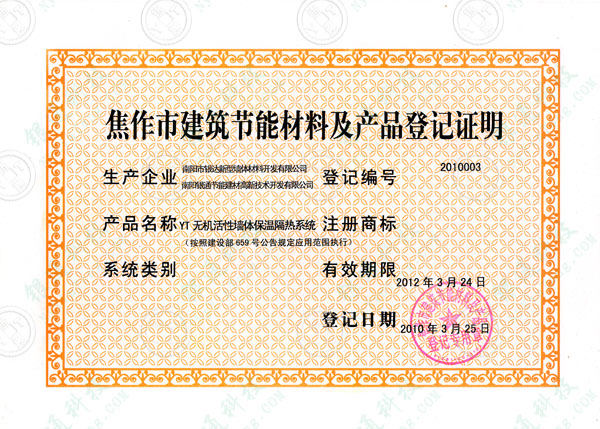 河南省焦作市建筑節(jié)能材料及產(chǎn)品登記證明 備案編號(hào)2010003 企業(yè)名稱南陽(yáng)銀通節(jié)能建材高新技術(shù)開(kāi)發(fā)有限公司 南陽(yáng)市銀達(dá)新型墻體材料開(kāi)發(fā)有限公司 產(chǎn)品名稱YT無(wú)機(jī)活性墻體保溫隔熱系統(tǒng) 規(guī)格型號(hào)YT-A 產(chǎn)品型號(hào)50kg/袋注冊(cè)商標(biāo)銀通 銀達(dá) 產(chǎn)品標(biāo)準(zhǔn)Q/YT004-2008 有效期限2012年3月24日 登記日期 2010年3月25日 焦作市建筑節(jié)能材料及產(chǎn)品備案專用章