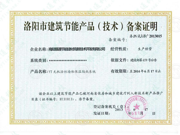 洛陽市建筑節(jié)能產(chǎn)品(技術(shù))備案證明 備案編號:洛JN試點推廣2013015 企業(yè)名稱:南陽銀通節(jié)能建材高新技術(shù)開發(fā)有限公司 經(jīng)營性質(zhì):生產(chǎn)經(jīng)營 依據(jù)文件:建設(shè)部第659號公告 產(chǎn)品名稱:YT無機活性墻體保溫隔熱系統(tǒng) 有效期限:至2013年6月16日止 該企業(yè)以上建筑節(jié)能產(chǎn)品已被河南省住房和城鄉(xiāng)建設(shè)廳列入新技術(shù)新產(chǎn)品推廣目錄(證書編號:H131013),準(zhǔn)予備案。 等級備案機關(guān)(章):洛陽市人民政府建筑節(jié)能工作領(lǐng)導(dǎo)小組辦公室 備案專用 發(fā)證日期:2013年06月17日