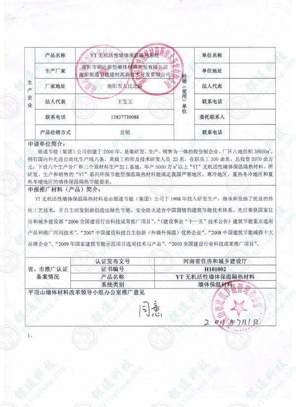 河南省平頂山市建筑節(jié)能材料備案登記證 企業(yè)名稱 南陽銀通節(jié)能建材高新技術開發(fā)有限公司 南陽市銀達新型墻體材料開發(fā)有限公司 產(chǎn)品名稱YT無機活性墻體保溫隔熱系統(tǒng) 系統(tǒng)類別墻體保溫材料 認證編號省建設廳推廣證書編號H101002 河南省住房和城鄉(xiāng)建設廳認證發(fā)布文號 規(guī)格型號YT-A 產(chǎn)品型號50kg/袋 注冊商標銀通 YT 平頂山市墻體材料改革領導小組辦公室推廣意見 同意備案 發(fā)證日期2011年7月1日