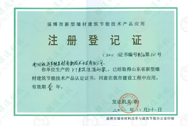山東淄博市新型墻體建筑節(jié)能技術(shù)產(chǎn)品應(yīng)用注冊登記證2011證書編號第521號 南陽銀通節(jié)能建材高新技術(shù)開發(fā)有限公司 你單位生產(chǎn)的yt建筑保溫砂漿 已經(jīng)取得山東省新型墻材建筑節(jié)能技術(shù)產(chǎn)品認定證書 同意在我市建設(shè)工程中應(yīng)用 有效期壹年 發(fā)證機關(guān) 淄博市墻體材料改革與建筑節(jié)能辦公室 二零零一八月三十一日