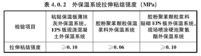 4.0.2 外保溫系統(tǒng)經(jīng)耐候性試驗(yàn)后,不得出現(xiàn)空鼓、剝落或脫落、開裂等的破壞,不得產(chǎn)生裂縫出現(xiàn)滲水;外保溫系統(tǒng)拉伸粘結(jié)強(qiáng)度應(yīng)符合表4.0.2的規(guī)定,且破壞部位應(yīng)位于保溫層內(nèi)。
