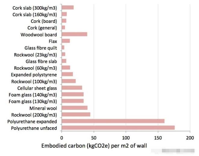 上面的表圖,但從厚度角度,肯定是厚度越厚,體積越大。我們下面來對比材料的隱含碳排放。隱含碳是指任何一種產(chǎn)品的生產(chǎn),都會直接或間接地產(chǎn)生碳排放,為了得到某種產(chǎn)品,而在整個(gè)生產(chǎn)鏈中所排放的二氧化碳。那么,越是那些化工產(chǎn)品,可能經(jīng)過了很多工藝,引起的隱含碳就越高。越是依靠天然材料就能加工制作的材料,其隱含碳就越少。下面這個(gè)就是各種保溫材料的隱含碳對比