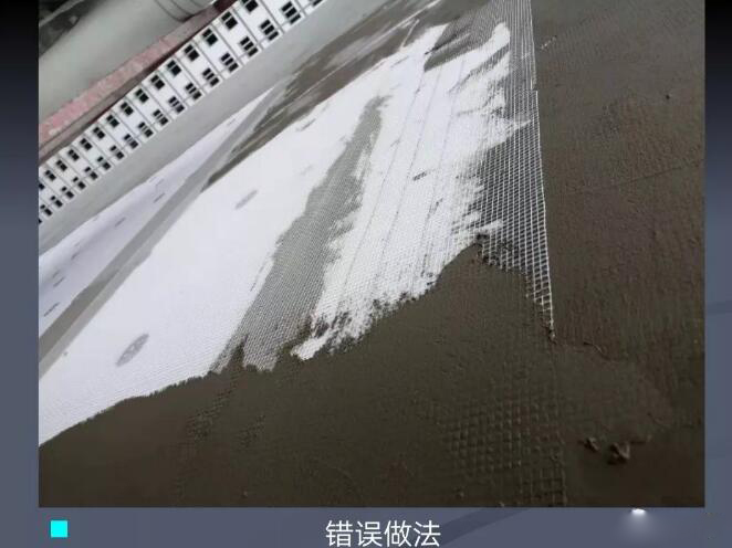 錯(cuò)誤原因:纖維網(wǎng)底面未抹砂漿或只有一點(diǎn)砂漿就掛玻纖網(wǎng)。