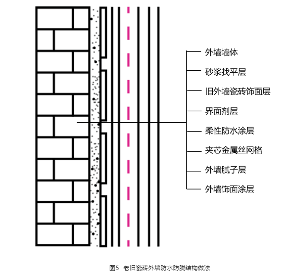 針對(duì)老舊小區(qū)外墻脫落問題,筆者公司研發(fā)了一種老舊瓷磚外墻防水防脫施工工藝,該工藝已經(jīng)在海南省舊改外墻項(xiàng)目大量應(yīng)用,均取得較好的施工效果,也申請(qǐng)了國(guó)家知識(shí)產(chǎn)權(quán)局的“實(shí)用新型專利”。該老舊瓷磚外墻防水防脫結(jié)構(gòu)做法見圖5。