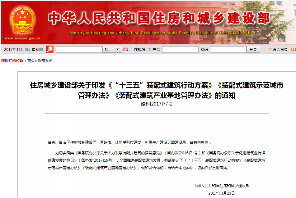 2017年3月,住建部發(fā)布《“十三五”裝配式建筑行動方案》,方案要求全面推進(jìn)裝配式建筑發(fā)展,到2020年,全國裝配式建筑占新建建筑的比例達(dá)到15%以上,培育50個以上裝配式建筑示范城市、200個以上裝配式建筑產(chǎn)業(yè)基地、500個以上裝配式建筑示范工程,建設(shè)30個以上裝配式建筑科技創(chuàng)新基地。